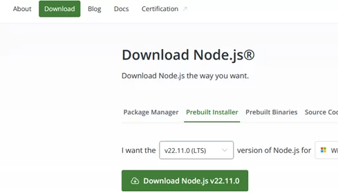 Η επίσημη ιστοσελίδα (https://nodejs.org/en/download/prebuilt-installer) παρέχει ένα πρόγραμμα εγκατάστασης MSI για το Node.js και το NPM. Εάν δεν υπάρχουν συγκεκριμένες απαιτήσεις, συνήθως συνιστάται η εγκατάσταση τουLTS(Μακροπρόθεσμη Υποστήριξη) έκδοση του Node.js.
