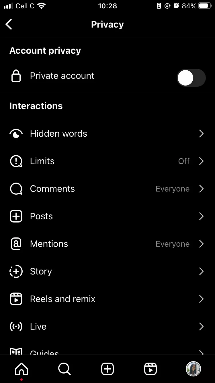 Ανοίξτε την εφαρμογή Instagram και πατήστε το δικό σαςεικονίδιο προφίλ, μενού τριών γραμμών > Ρυθμίσεις και απόρρητο > Απόρρητο λογαριασμούκαι ενεργοποιήστεΙδιωτικός λογαριασμός.