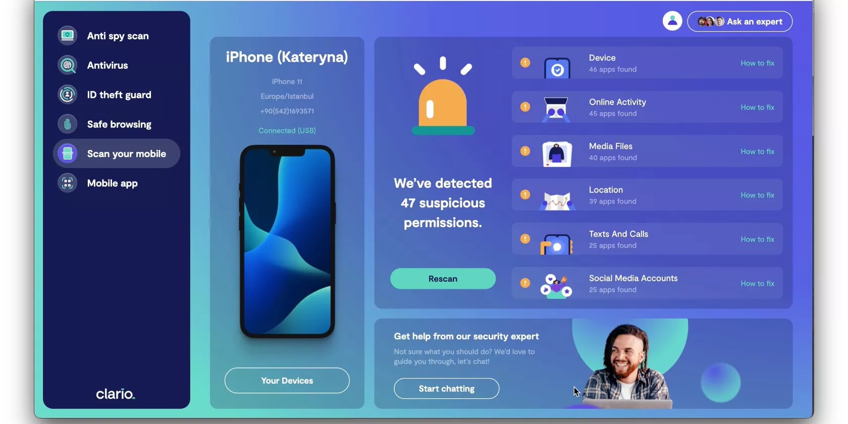 Συνιστούμε να χρησιμοποιήσετε το Clario'sΣαρώστε το κινητό σαςδυνατότητα στην εφαρμογή υπολογιστών του Clario. Εκτελεί διεξοδικά μια σάρωση anti-spyware της κινητής συσκευής σας για να εντοπίσει τυχόν κακόβουλες εφαρμογές και ύποπτες άδειες. Αυτό μπορεί να σας βοηθήσει να εξαλείψετε την αθόρυβη παρακολούθηση και εγγραφή στο iPhone ή το iPad σας.