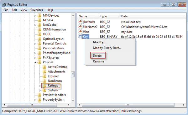 Κάντε κλικ στοΑκροαματικότηταντοσιέ. Στο δεξιό τμήμα του παραθύρου, κάντε δεξί κλικ στοΚλειδίκαι κάντε κλικΔιαγράφω.ΚλικΝαίστο αναδυόμενο παράθυρο διαλόγου για να διαγράψετε το κλειδί. Αυτό θα διαγράψει τον κωδικό πρόσβασης Content Advisor από τον Internet Explorer σας.
