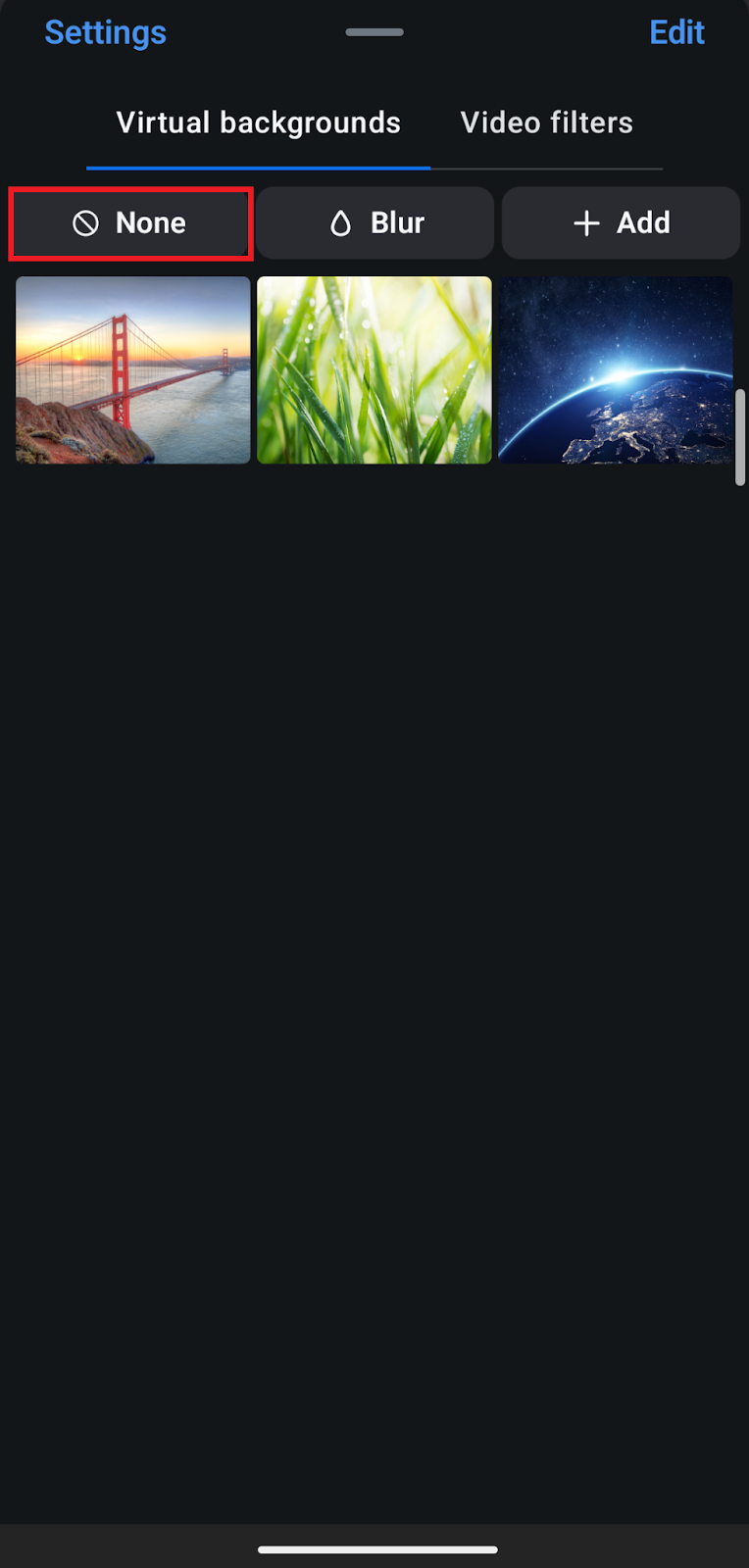 - Κάντε κύλιση προς τα κάτω στοΕικονικά Φόντα, μετά επιλέξτεΚανέναςγια να αφαιρέσετε το τρέχον εικονικό σας φόντο.