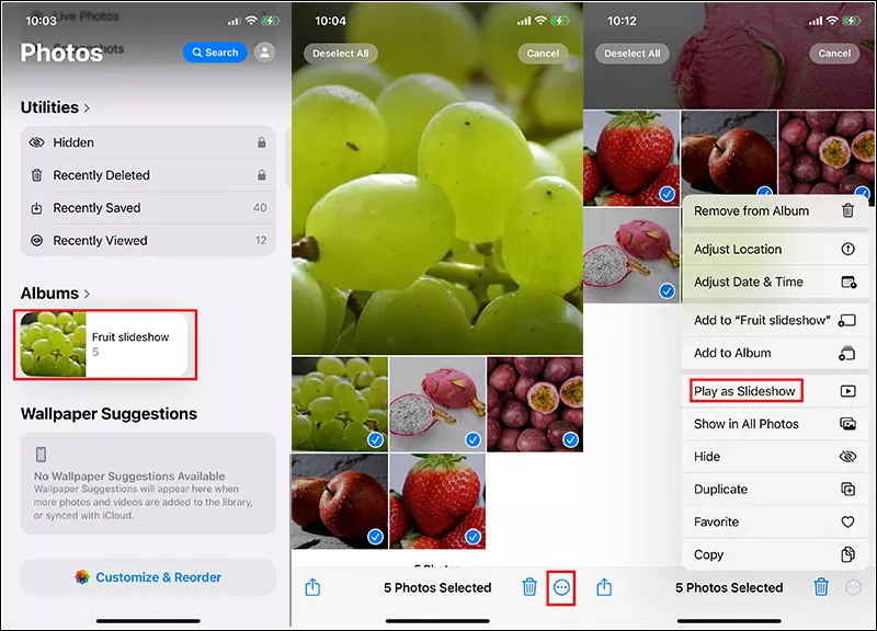 Για συσκευές iOS 18:Πατήστε τις επιλογές των τριών κουκκίδων και επιλέξτε Αναπαραγωγή ως παρουσίαση. Η προβολή διαφανειών θα αρχίσει να παίζει με τη σειρά των φωτογραφιών του άλμπουμ από προεπιλογή και όχι με τη σειρά που έχει επιλέξει ο χρήστης.