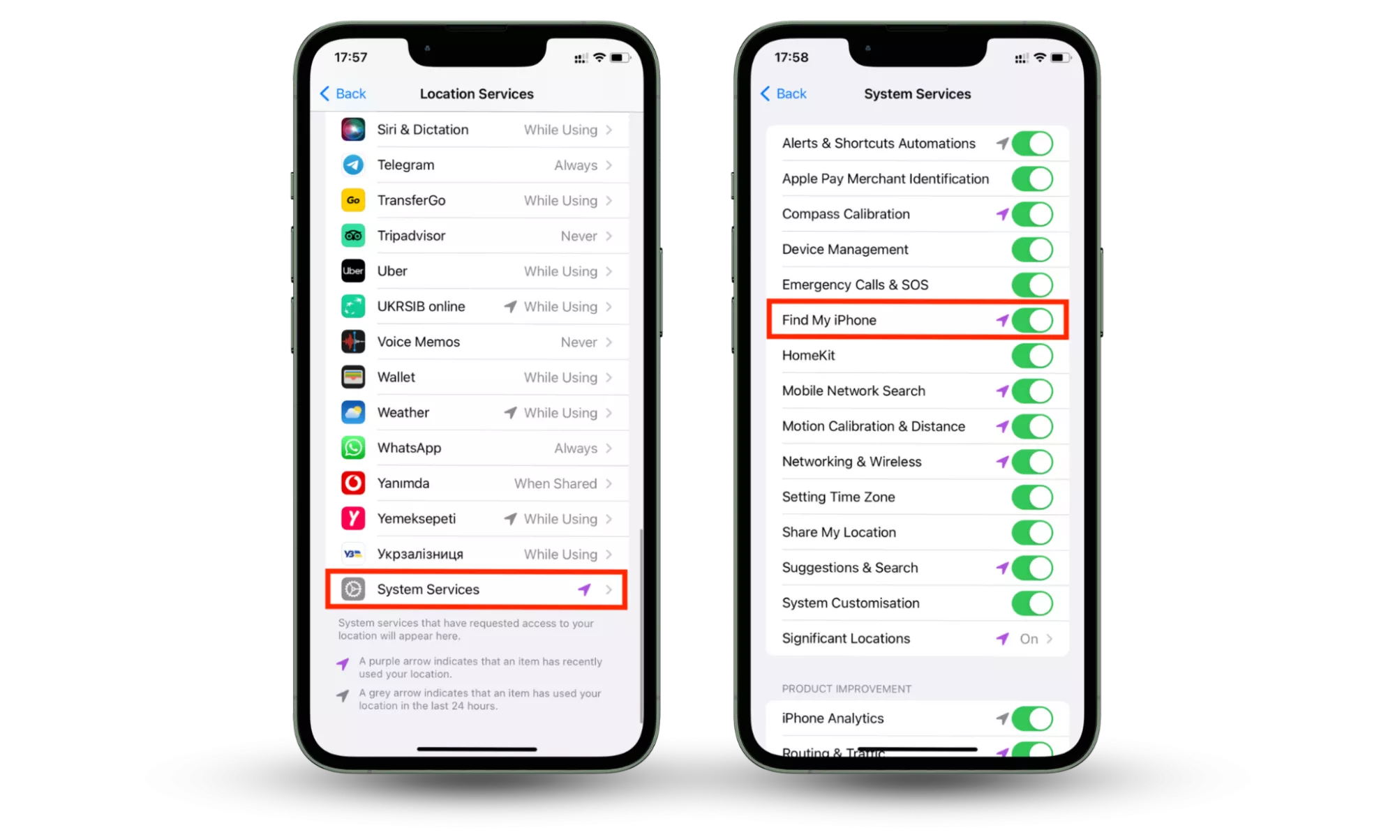 - ΕπιλέγωΥπηρεσίες Συστήματοςστο κάτω μέρος της σελίδας και ενεργοποιήστεΕύρεση του iPhone μου.