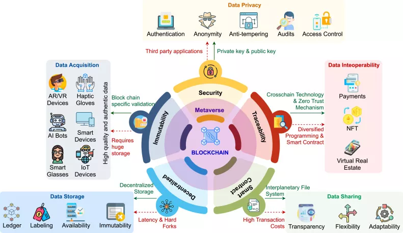 - Blockchain. Οι περισσότερες εφαρμογές στο metaverse τρέχουν με τεχνολογία blockchain, η οποία επιτρέπει στους προγραμματιστές να προσθέσουν τις απαραίτητες λειτουργίες στο metaverse