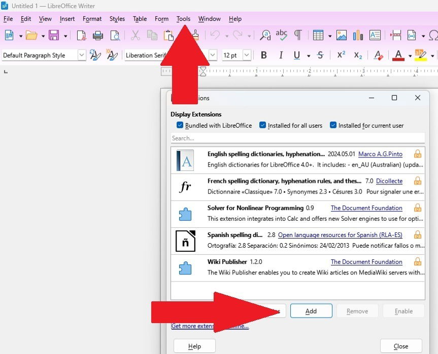 Ανοίξτε το LibreOffice Writer και επιλέξτεΕργαλεία -> Επεκτάσεις. ΚλικΠροσθέτω. Επιλέξτε το αρχείο που μόλις αποθηκεύσατε και πατήστεΑποδέχομαινα αποδεχτείτε τους όρους.