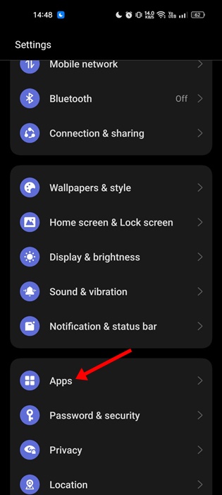 1. Εκκινήστε την εφαρμογή Ρυθμίσεις στο Android σας και επιλέξτεΕφαρμογές.