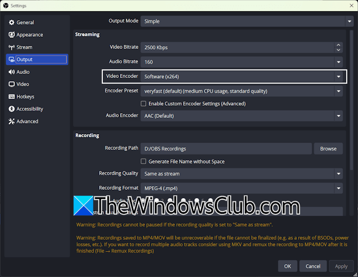- Επιλέξτε έναν άλλο κωδικοποιητή βίντεο για ροή και εγγραφή.