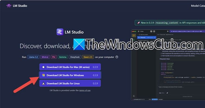 Πρώτα απ 'όλα, πρέπει να λάβουμε το εργαλείο LM Studio από την επίσημη ιστοσελίδα τους. Επομένως, για αυτό, πρέπει να πάτεlmstudio.ai. Εφόσον χρησιμοποιώ Windows, θα επιλέξωΚατεβάστε το LM Studio για Windows,αλλά ανάλογα με την πλατφόρμα σας, πρέπει να κάνετε λήψη της έκδοσης LM Studio. Μόλις γίνει, αυτό θα ενεργοποιήσει τη λήψη του σεβαστού αρχείου exe.