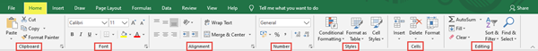 Η καρτέλα Αρχική σελίδα είναι η προεπιλεγμένη καρτέλα στο φύλλο εργασίας του Microsoft Excel. Αυτή η καρτέλα περιλαμβάνει ενότητες όπωςΠρόχειρο, Γραμματοσειρά, Στοίχιση, Αριθμός, Στυλ, Κελιά και Επεξεργασία.