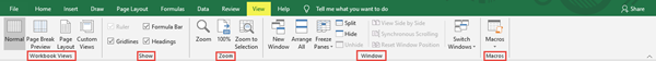 Στην καρτέλα Προβολή, θα δείτε ενότητες όπως π.χΠροβολές βιβλίου εργασίας, Εμφάνιση, Ζουμ, Παράθυρο και Μακροεντολές.
