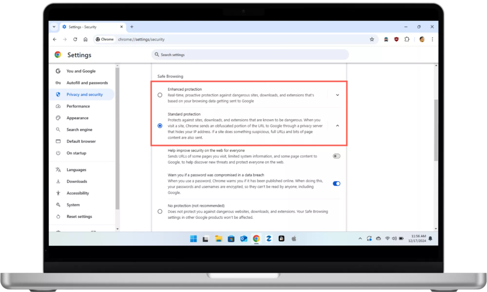 Voit varmistaa, että Selaussuoja on aktiivinen Chromessa: