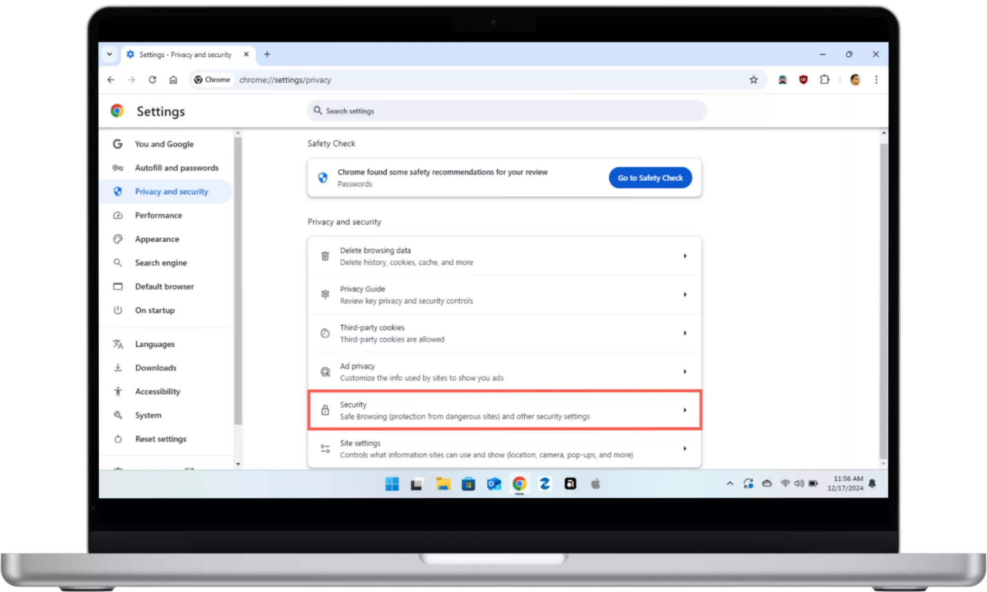 Voit myös suorittaa turvatarkistuksen Chromessa tunnistaaksesi haitalliset laajennukset ja muut tietoturvaongelmat. Voit tehdä sen valitsemallaYksityisyys ja turvallisuuspäälläAsetuksetsivupalkki ja valitseSiirry kohtaan Turvatarkastus.