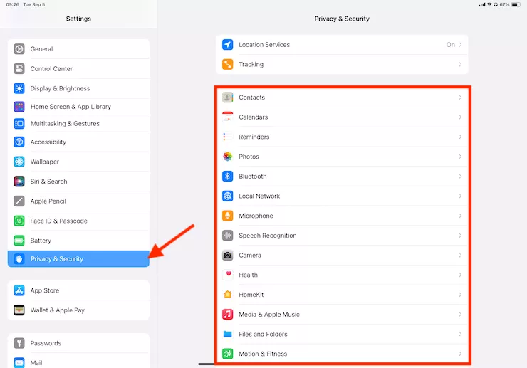Vaihe 1. Näet kaikki käyttöoikeudet napauttamalla Yksityisyys ja suojaus Asetuksissa