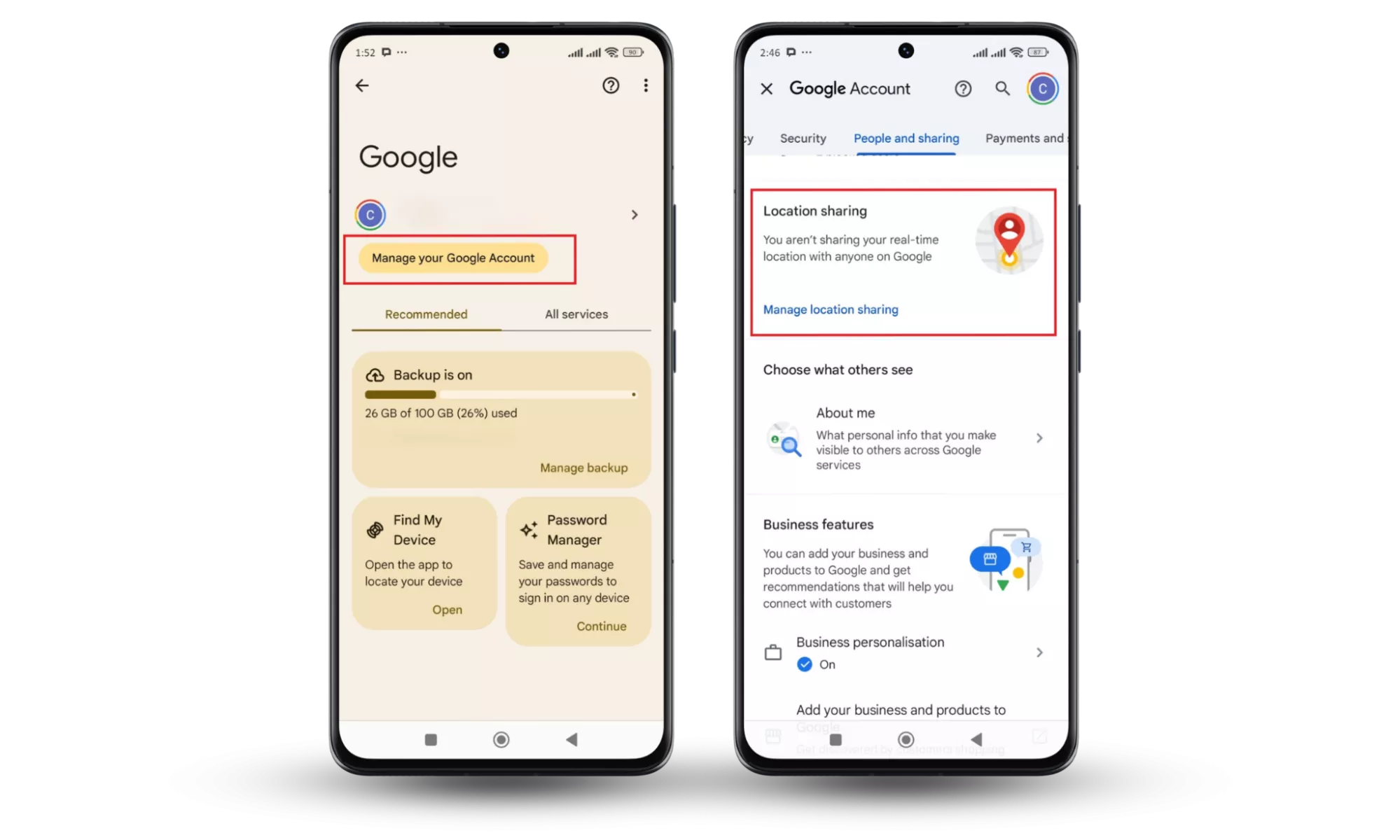 Vaiheet 2–4: Siirry kohtaan Hallitse Google-tiliäsi > napauta Ihmiset ja jakaminen > Tarkista sijainnin jakaminen.iPhonelle: