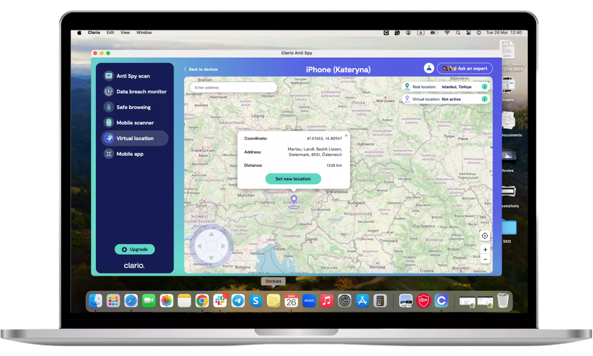 Vaiheet 1–3: Lataa Clario Anti Spy > Virtuaalinen sijainti.