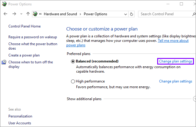 Vaihe 1: Mene osoitteeseenOhjauspaneeli> Virta-asetuksetja valitse sittenMuuta suunnitelman asetuksia.