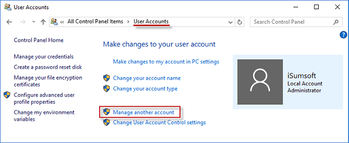 Vaihe 1: PainaWin + Xsiirtyäksesi Ohjauspaneeli > Käyttäjätili >Hallinnoi toista tiliävaihtoehto.