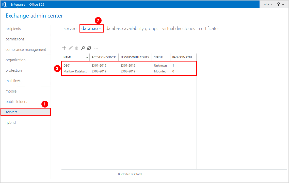 - Postilaatikon tietokantaDB01on ainoa postilaatikkotietokanta, joka oli käytössä EX01-2019:ssä. Valitettavasti nyt, kun EX01-2019 on offline-tilassa, tietokannan postilaatikon liitännän tila onTuntematon(Offline), eikä mikään toimi.