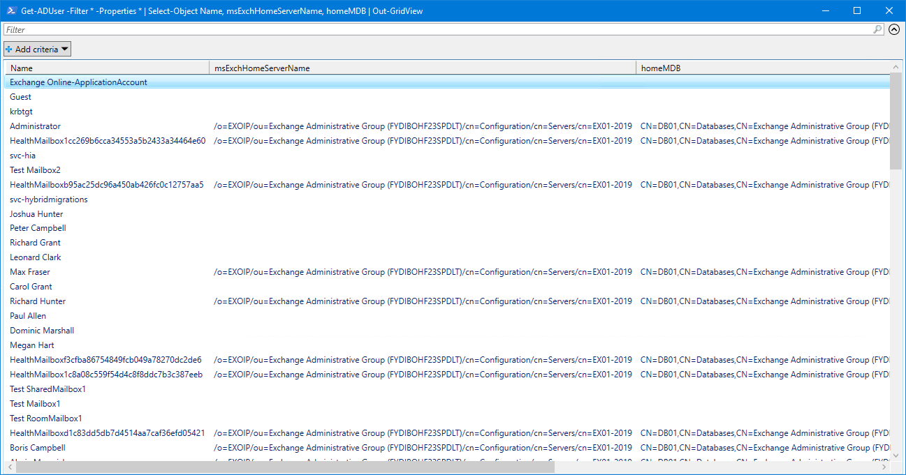 Get-ADUser -Filter {msExchHomeServerName -eq $msExchHomeServerName -and homeMDB -eq $homeMDB} -Properties msExchHomeServerName, homeMDB | Select-Object Name, msExchHomeServerName, homeMDB | Sort-Object Name | Out-GridViewTuotos näyttää tältä.