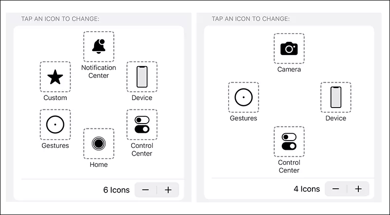 Vinkkejä:Voit lisätä uusia kuvakkeita tai poistaa olemassa olevia kuvakkeita Assistive Touch Menu -valikossa napauttamalla "+"- tai "-"-painikkeita.