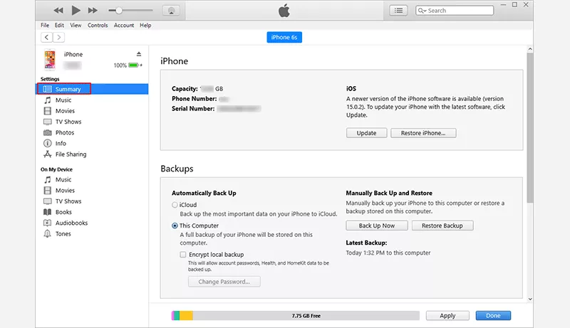 Vaihe 4:ValitseYhteenveto-vaihtoehto vasemmalla, ja laitetiedot tulevat näkyviin