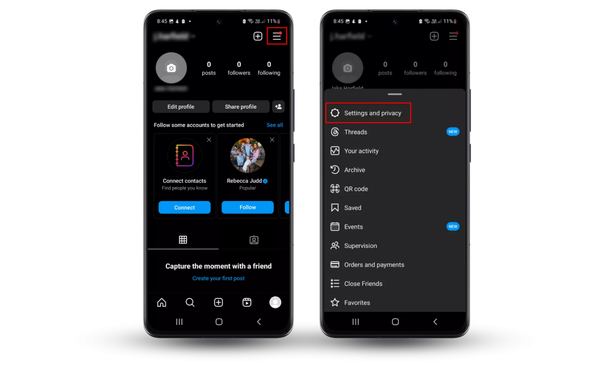 Vaiheet 1-2: Avaa Instagram, valitse hampurilaiskuvake ja valitse sitten Asetukset ja tietosuoja.
