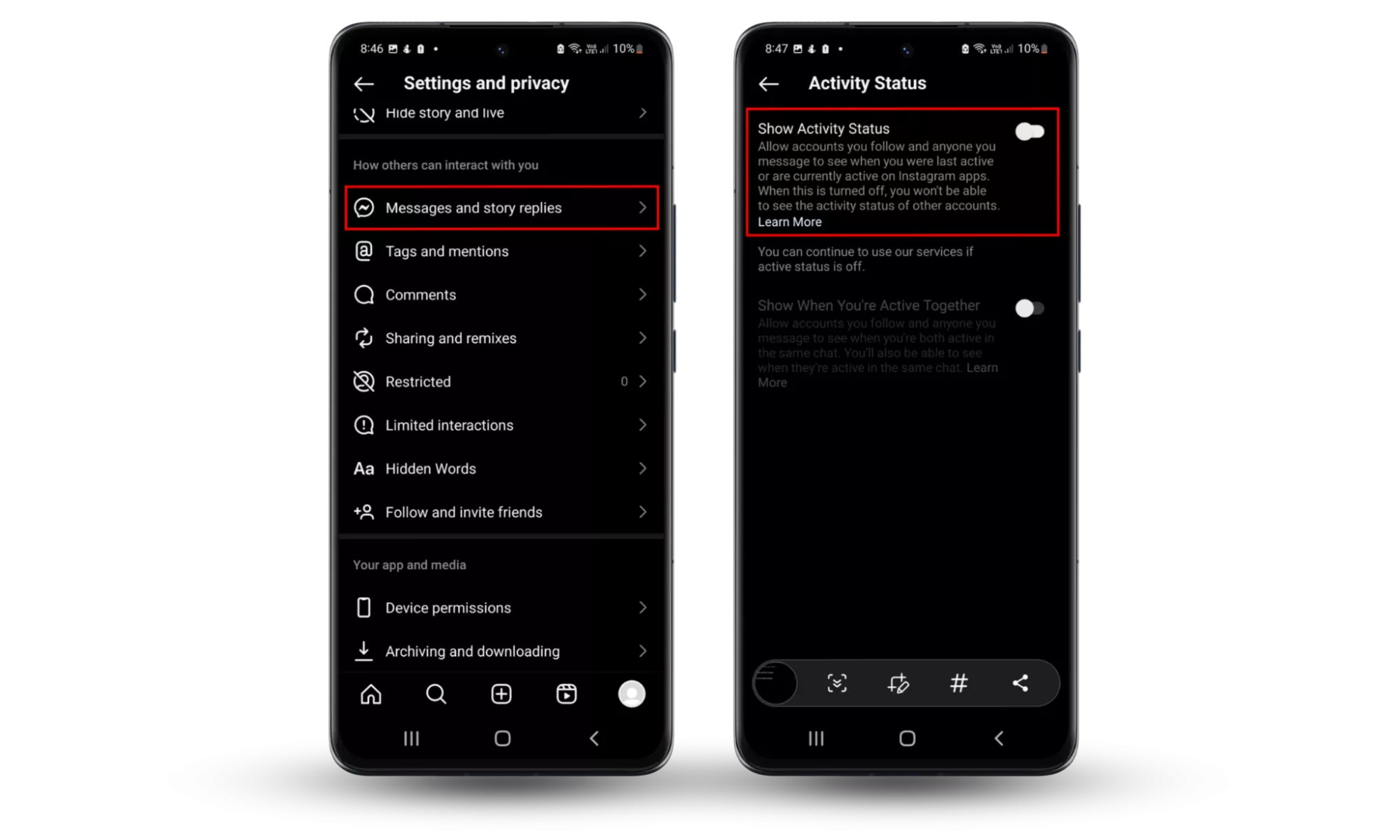 Aktiivisuutesi näyttää muille käyttäjille, milloin olit viimeksi aktiivinen (tai jos olet tällä hetkellä aktiivinen). Jos tämä vaihtoehto on käytössä, kuka tahansa voi nähdä, kun olet verkossa, ja seurata päivittäisiä tottumuksiasi. He voivat esimerkiksi nähdä, että vierität Instagramia joka päivä klo 17.00, mikä voi auttaa heitä vainoamaan sinua.