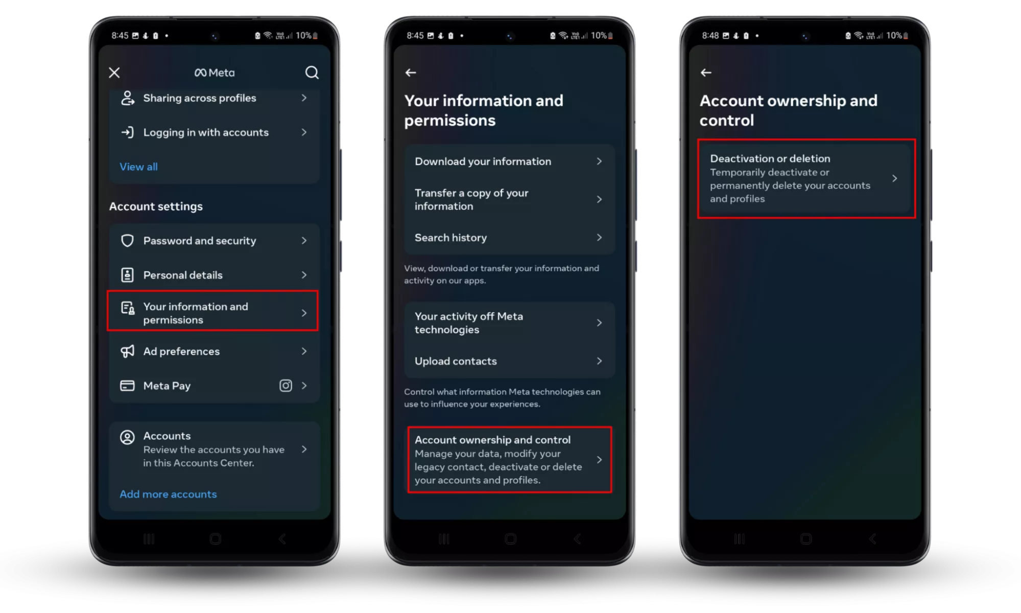 Vaiheet 3-5: Valitse Tietosi ja käyttöoikeutesi, valitse Tilin omistajuus ja hallinta, paina sitten Deaktivointi tai poisto ja seuraa näytön ohjeita.Instagram-tilisi poistaminen iPhonessa: