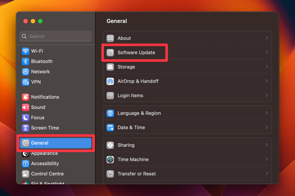 Näyttökuva Finder-valikosta Macissa, jossa System Settings -vaihtoehto korostettuna- NapsautaKenraalija valitseOhjelmistopäivitysavataksesi päivitysvalikon.