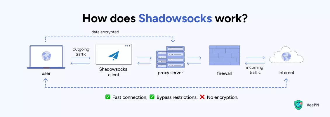 Shadowsocks luotiin auttamaan käyttäjiä ohittamaan liikennerajoitukset ja hallituksen asettamat palomuurit maissa, joissa Internet-sensuuri on tiukka, kuten Kiinassa, Iranissa ja Venäjällä. Mutta jotkin syväpakettien tarkistus (DPI) -tekniikat voivat silti havaita ja rajoittaa Shadowsocks-liikennettä. Kun yhdistetäänVeePN:n salaus, liikenne on täysin anonyymiä ja havaitsematonta.