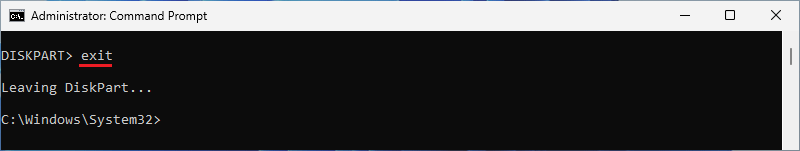 Vaihe 7:Poistu DiskPartista kirjoittamallapoistuja painamallaEnter.