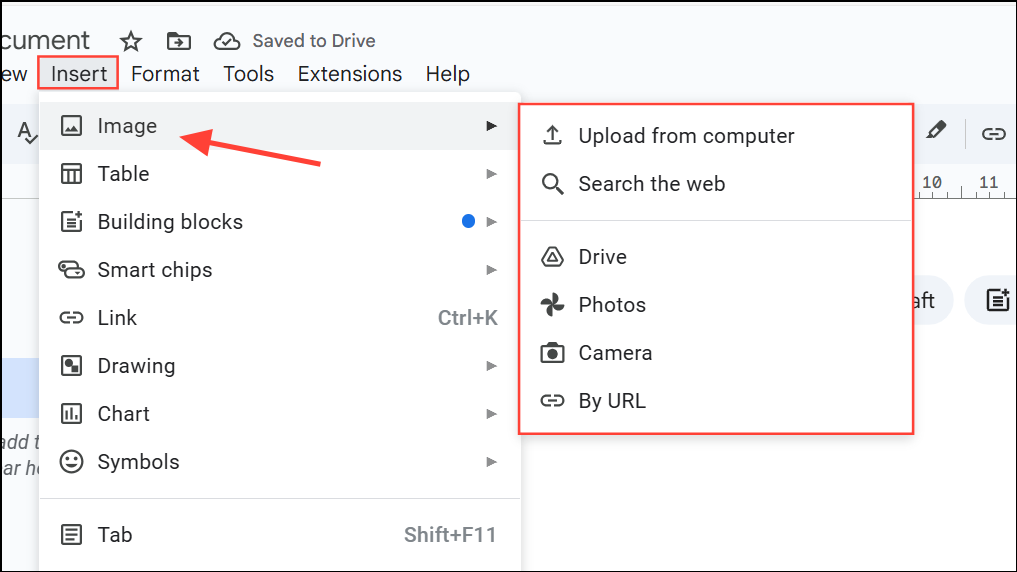 Vaihe 1:Lisää kuvat suoraan asiakirjaan käyttämälläLisää>Kuva. Valitse kuvat laitteestasi, Drivesta tai verkkohausta.