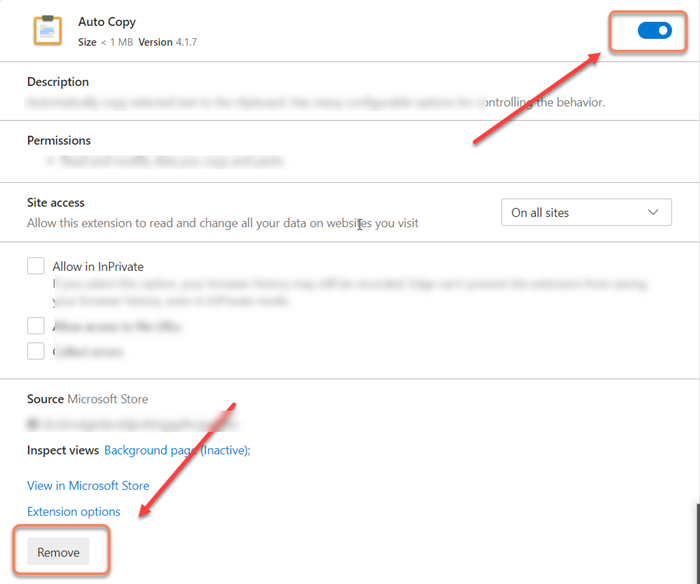Se avaa laajennuskohtaisen sivun, joka antaa tietoja sen luvista, sivuston käyttöoikeuksista, InPrivate-luvista, tiedostojen URL-osoitteiden pääsystä, kerää virheitä ja niin edelleen.