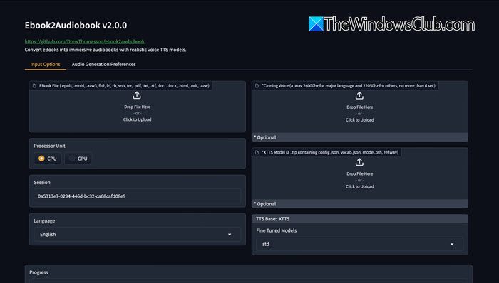Tarvitset ebook2audiobookXTTS:n asentamiseenPython 3.x, kaliiperi, FFmpeg,jaCook-TTS. Työkalu on saatavilla sekä komentorivi (CLI) että graafinen käyttöliittymä (GUI) -tilassa. Sen voi ladata GitHubin kautta käyttämällätämä linkki. Saatavilla on myös Docker-kuva, joka on helppo ottaa käyttöön, ja live-demo Hugging Face Spacesta käytännön testausta varten.