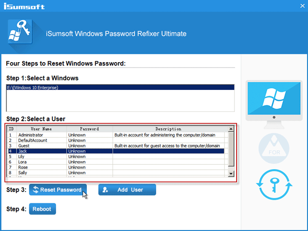 Étape 4 : Si vous démarrez correctement votre ordinateur à partir de ce disque de démarrage, Windows Password Refixer devrait fonctionner et apparaître sur votre écran. Il affiche Windows 10 exécuté sur votre ordinateur et affiche une liste complète de tous les comptes d'utilisateurs existants sur votre Windows 10, y compris les comptes d'utilisateurs désactivés et masqués.