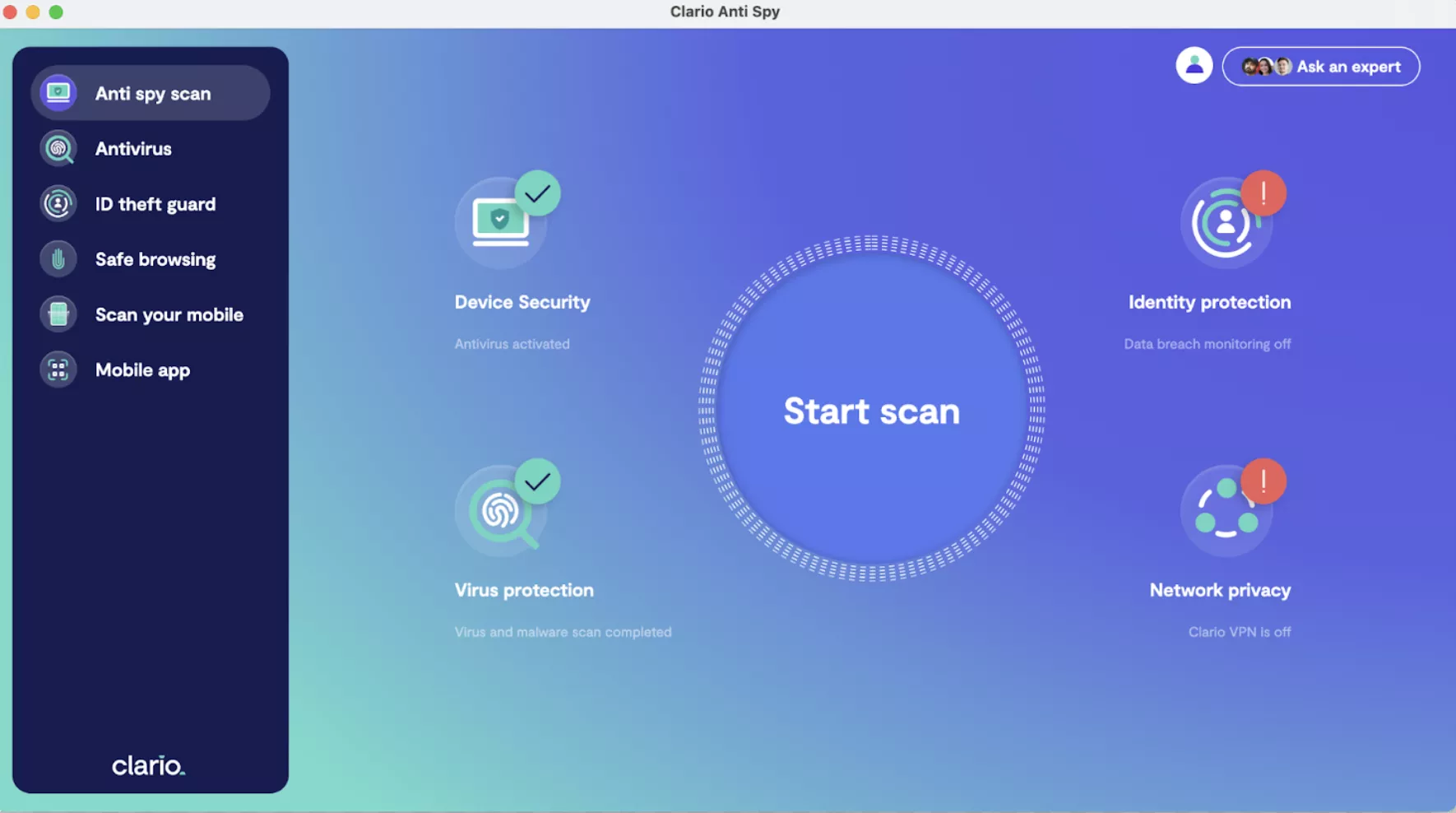 AntiSpy de Clario propose une suite d'outils de sécurité puissants qui fonctionnent en synergie pour protéger tous vos appareils et données contre l'espionnage. Il propose des outils de détection des violations de données, des analyses antivirus pour détecter les logiciels malveillants et une navigation sécurisée pour bloquer les publicités et les trackers. Clario AntiSpy fonctionne sur mobile (iOS, Android) et sur ordinateur (Windows, Mac).