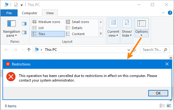 User Configuration > Administrative Templates > Windows Components > Windows Explorer - Double-cliquez sur la politique »Ne pas autoriser l'ouverture des options des dossiers à partir du bouton Options de l'onglet Affichage du ruban." dans le volet de droite. Pour Windows 7/Vista/XP, cette stratégie est appelée "Supprime l'élément de menu Options des dossiers du menu Outils“.
