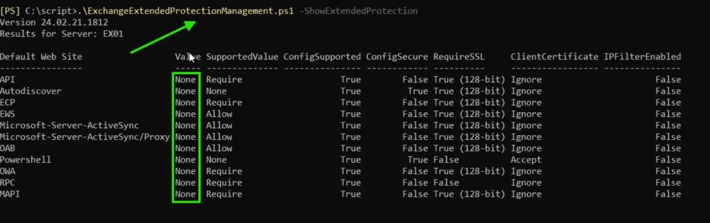 .ExchangeExtendedProtectionManagement.ps1 –ShowExtendedProtectionNous verrons le résultat ci-dessous