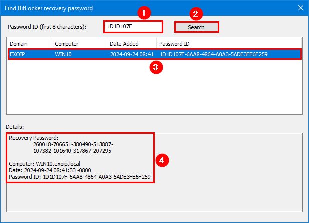 Vous pouvez également rechercher dans Active Directory leID de clé de récupération Bitlockerpour extraire le mot de passe de récupération BitLocker.