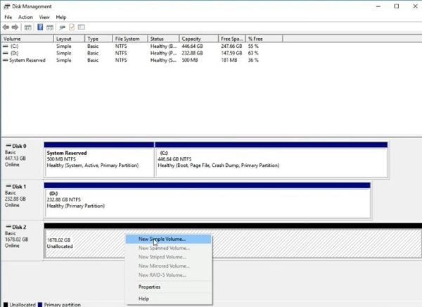Étape 4 : Faites un clic droit sur le disque et cliquez sur Nouveau volume simple. Spécifiez la taille du volume et attribuez une lettre de lecteur.