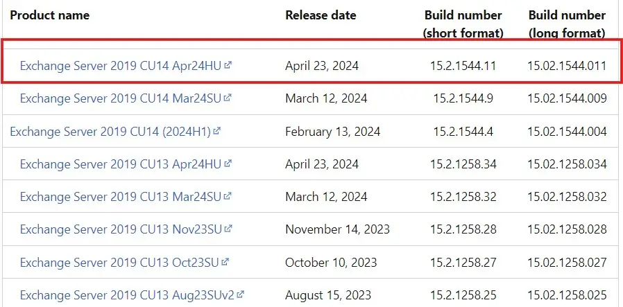 Pour confirmer la dernière mise à jour de la version, vous pouvez visiter lePage officielle de Microsoftpour la vérification de la version Exchange.