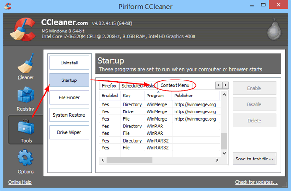 Rendez-vous sur le site Web de Piriform et téléchargez la version gratuite de CCleaner. Après avoir exécuté CCleaner, cliquez sur le boutonOutilssection sur le côté gauche. Sur le côté droit, cliquez surDémarrerpuis cliquez surMenu contextuel. À partir de là, vous pouvez désactiver ou supprimer toutes les extensions shell tierces.