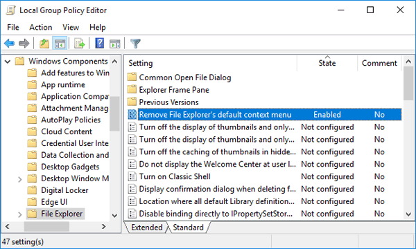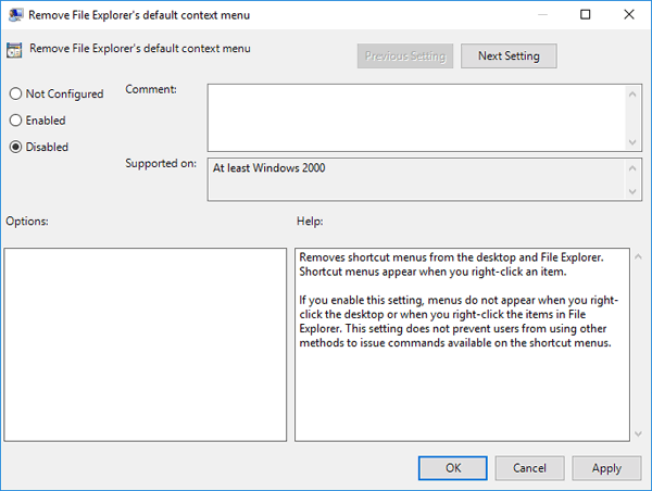 Si vous n'avez pas accès à l'éditeur de stratégie de groupe local, veuillez plutôt utiliser ce hack de registre pour activer le menu contextuel de l'Explorateur Windows :
