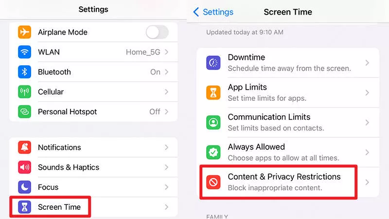 1. Ouvrez l'application Paramètres et appuyez sur Temps d'écran > Restrictions relatives au contenu et à la confidentialité.