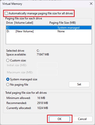 La réinitialisation de la mémoire virtuelle peut aider à résoudre une utilisation élevée du disque causée par une RAM insuffisante. Suivez ces étapes pour réinitialiser votre mémoire virtuelle :
