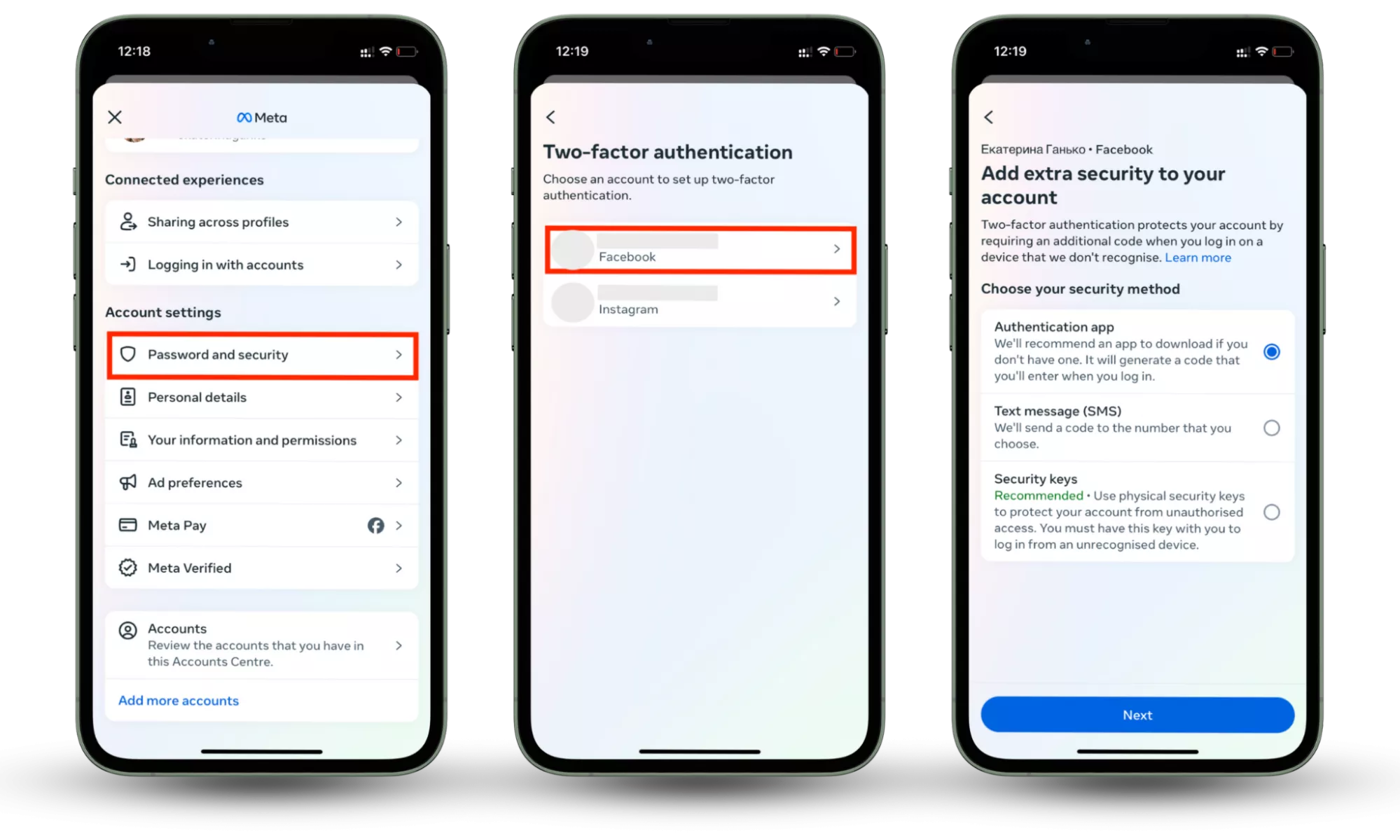 - Sélectionnez votre compte et sélectionnez la manière dont vous souhaitez ajouter une sécurité supplémentaire : application d'authentification, message texte ou clés de sécurité.