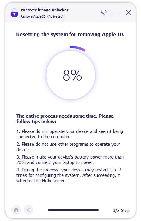 Étape 3 :L'outil commencera à supprimer l'identifiant Apple de votre iPhone sans compromettre aucune de ses fonctionnalités si la fonction « Trouver mon » et l'authentification à deux facteurs sont activées. Mais si l'authentification à deux facteurs est désactivée et « Find My » activé, l'écran de verrouillage d'activation sera activé (vous pouvez le contourner avec Passixy iPhone Unlocker). Cliquez ensuite sur « 0000 » confirmez le déverrouillage