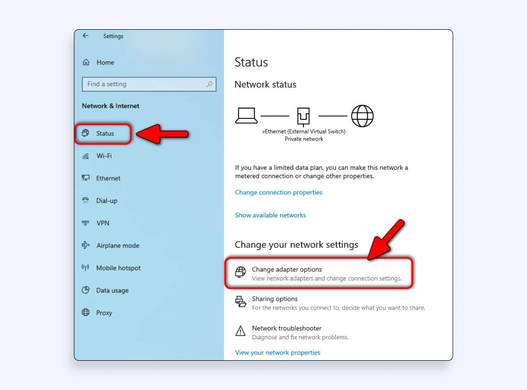(Ouvrez Paramètres → Réseau et Internet → Modifier les options de l'adaptateur).
