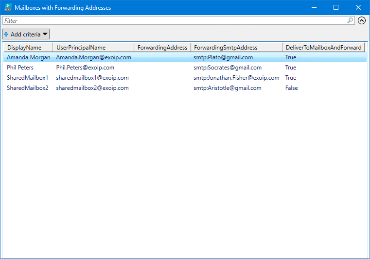 $mailboxProperties | Out-GridView -Title "Mailboxes with Forwarding Addresses"