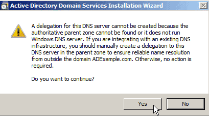 17.Vous recevrez une fenêtre d'avertissement indiquant que la délégation pour ce serveur DNS ne peut pas être créée, mais comme il s'agit du premier serveur DNS, vous pouvez simplement cliquer surOuiet ignorez cet avertissement.